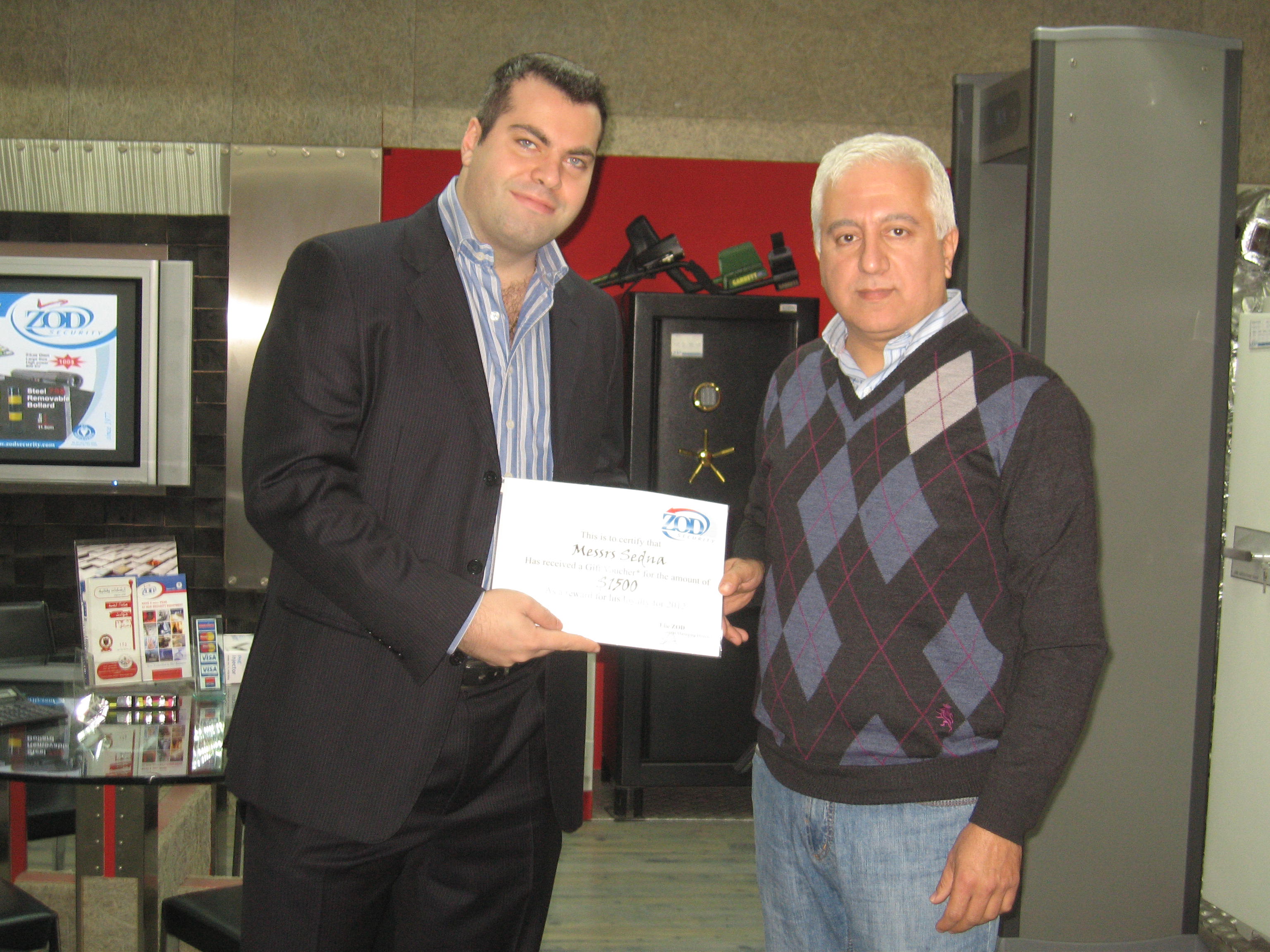 Beirut, Lebanon – Congratulations to the first winner from Zod Security’s 2012 electricians’ loyalty program – On the morning of February 25, 2013, Zod Security’s Assistant Managing Director Mr. Elie Zod, presented Sedna with its $1,500 reward, thanking them for their loyalty to Zod Security. Mr. Bassam Mahfouz, Sedna’s owner, received the reward on behalf of his company.