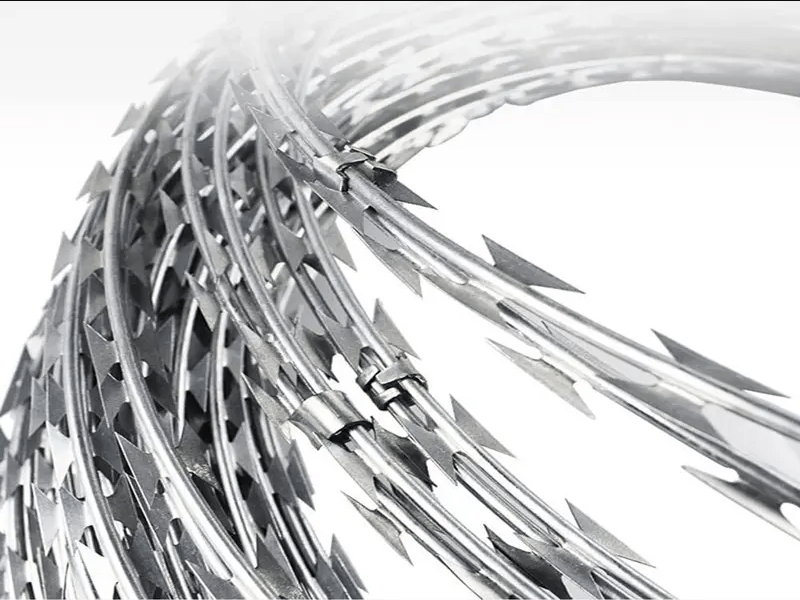 It is made of coils of barbed wire that are expanded to form a concertina shape, making it difficult to climb over or cut through.