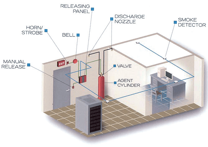 When the detection tubing bursts, there is a pressure change in the system. This activates a valve, which releases gas or powder stored in the cylinder. Unlike fire extinguishers, FM200 systems do not require manual operation. However, systems can be manually operated by pushing a button called the manual release.